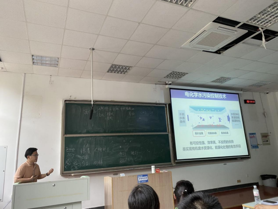 张弓教授介绍了电化学水处理技术在水中病原微生物消杀方面的应用。首先,张弓老师介绍了高级氧化水处理技术,让大家了解了污水处理的具体原理。接着,以芬顿法产生活性氧以及污水加氯气产生自由氯可以杀死微生物为线索,介绍了电化学芬顿法的原理、优势以及具体应用。而后,介绍了由自由氯介导的化学氧化过程---紫外-氯联用杀菌以及物理破坏作用协同化学氧化灭菌过程。该场报告极大地补充了学生们在电化学处理水方面的知识空白,掌声此起彼伏,让学生对电化学氧化灭活病原微生物的应用有了很深的了解,同时学习了张弓教授处理问题的思维方式,开阔了眼界,更激发了学习兴趣。