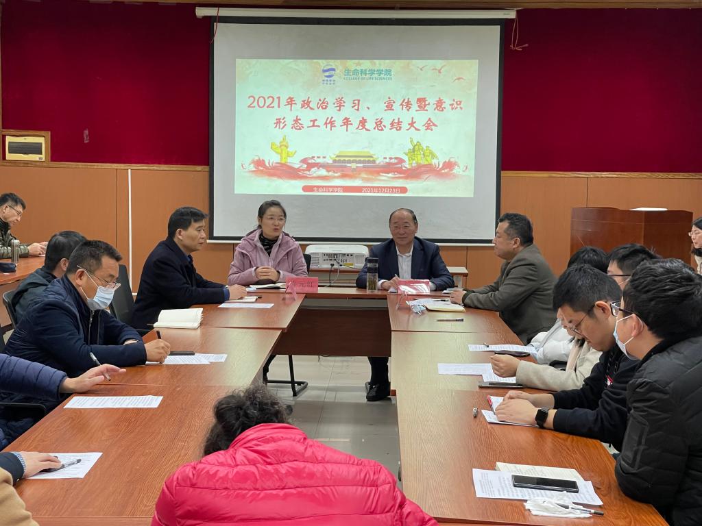 的宣传和意识形态工作做了总结。他指出,一是全院教职工要提高政治站位,用“四个意识”导航,用“四个自信”强基,用“两个维护”铸魂,全面贯彻党的教育方针,落实立德树人根本任务,以钉钉子精神把工作落地落实。二是要抓牢抓实意识形态工作,全体教职工都要进一步提高意识形态工作的自觉性,充分认识在新的历史时期意识形态工作的重要性并做好意识形态工作!学院各部门要进一步强化和明确意识形态工作主体责任,推动意识形态工作落实到位。三是将宣传工作和学院各项中心工作相结合,同步考虑、同步部署、同步实施、同步检查,真正把宣传工作放在心上、抓在手里、扛在肩上。四是加强学习、提高本领。以党的十九届六中全会精神为重点,坚持用习近平新时代中国特色社会主义思想武装头脑、凝心聚魂,通过生科先锋、学习强国、“三会一课”、座谈会等形式、方式,进一步强化学习意识,提高信息辨别力,把握导向,唱响宣传和意识形态工作的“主旋律”。