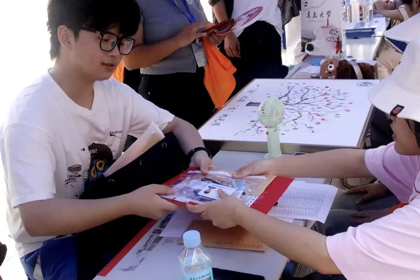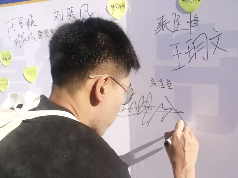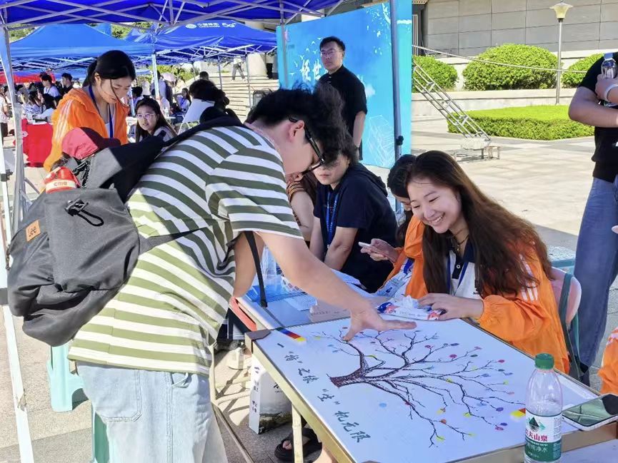 现场洋溢着温馨热烈的氛围,新生们纷纷在主题背景墙上签名留念,在便利贴上书写大学寄语,并在象征生命之树的展板上按下彩色指纹。一个个指纹逐渐汇聚成枝繁叶茂的大树,寓意新生将在h动漫