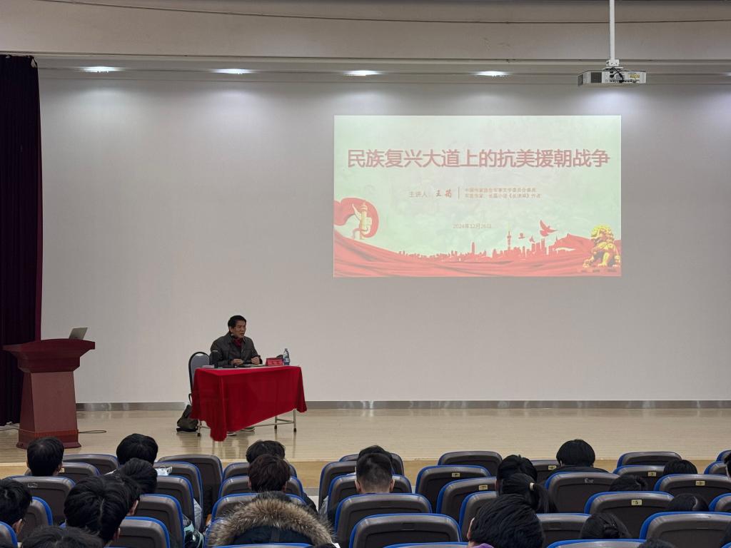 为加强同学们的理论学习,聚焦理想信念教育、政治素养提升、综合能力的提高,h动漫 于2024年12月27日邀请《长津湖》作家王筠在金家岭校区图文四楼报告厅位大一学生开展“民族复兴大道的抗美援朝战争”主题讲座。