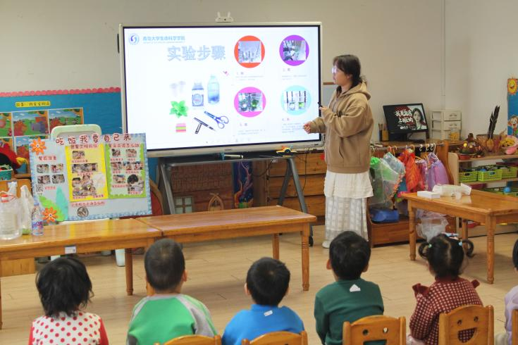 前往青岛市实验幼儿园开展“走进神奇的树叶”志愿讲解活动。志愿者们精心准备的简单生物现象讲解与科学小实验两个环节受到了小朋友们的热烈欢迎。