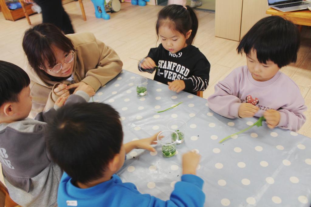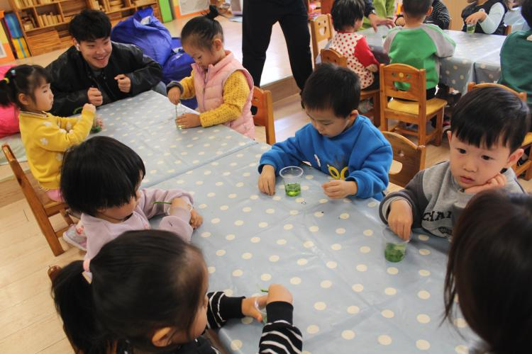 在科学小实验环节,志愿者帮助小朋友们利用酒精从叶片中简易提取了叶绿素,让小朋友们亲手感受到了生物学的神奇与魅力。