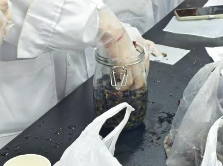 20241017日,本次大赛正式拉开帷幕,各参赛队伍于博雅108室开展此次大赛的初步酿造工作,参赛选手们依次对葡萄进行清洗、除梗、压碎和装罐操作。大家不仅学会了酿酒的知识和方法,同时也体会到了酿酒的乐趣。实验室环节结束后,选手们获得了初步制作的葡萄酒,静候葡萄酒的发酵。