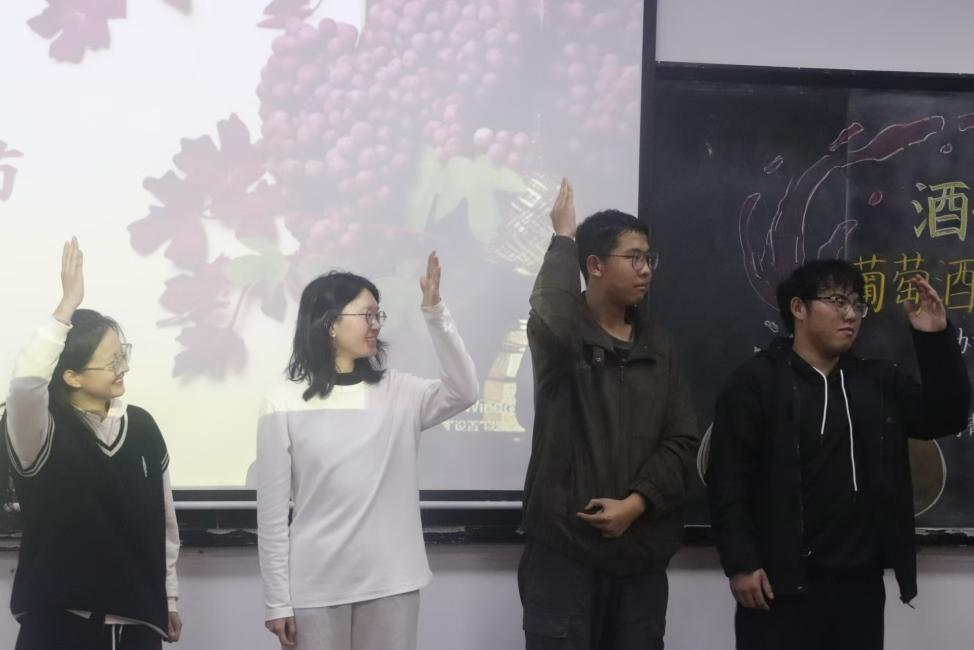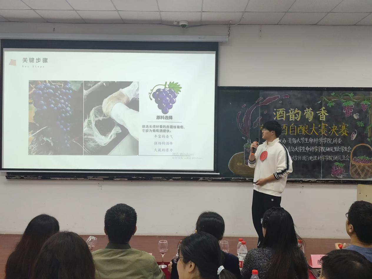决赛现场各参赛队伍代表依次上台,通过精心准备的PPT向大家讲述了葡萄酒酿造的前期准备、酿酒过程以及心得体会与大家分享了葡萄酒“诞生”与“成长”的故事。九位评委从色味等多角度对各团队酿制的葡萄酒进行评分。