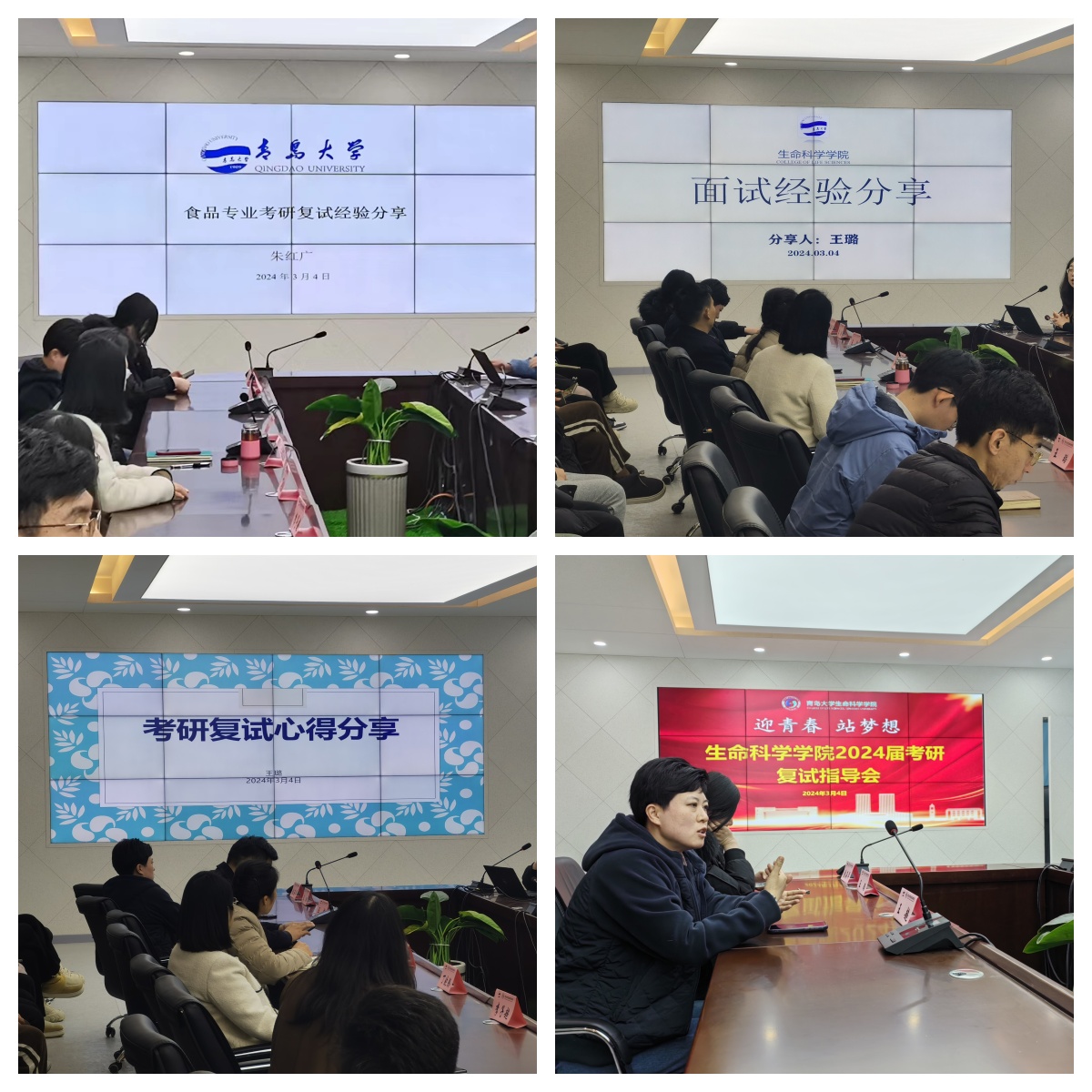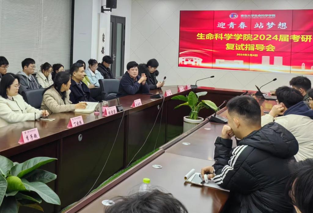在博雅楼113会议室举办“迎青春 站梦想”考研复试指导会。学院党委副书记张雪蕾、副院长孙海新、院长助理丁晓腾、生物技术系主任王超、两位王璐老师、以及朱红广、唐淑玮、崔坤鹏等多位老师到场,为2024届考研学子进行复试指导。