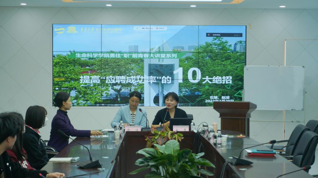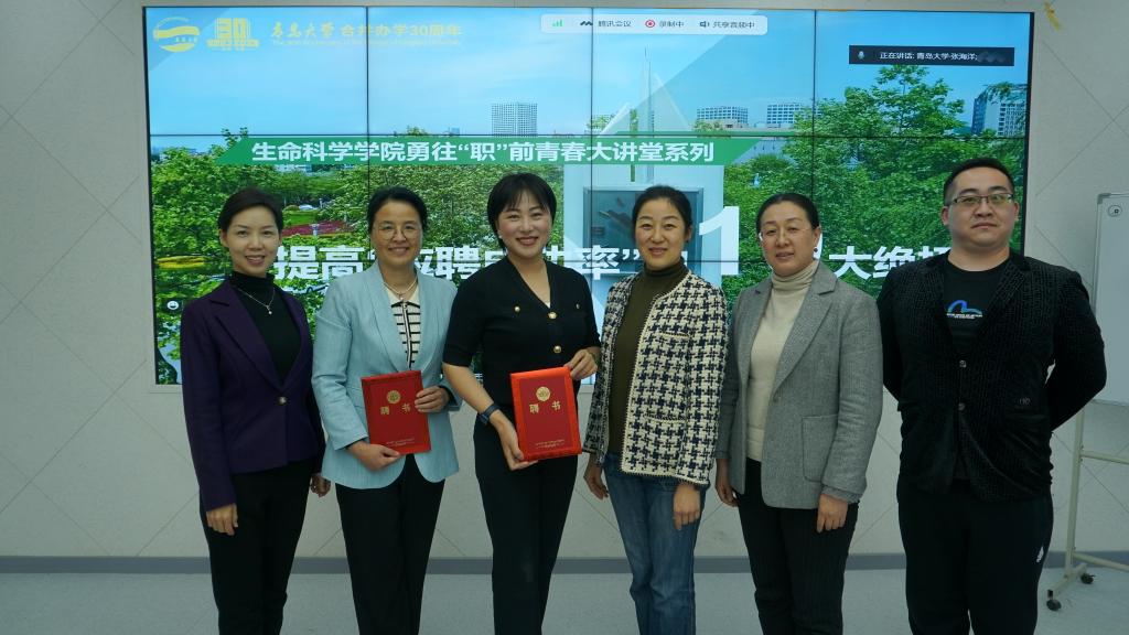 举办“就业创业导师”聘任仪式暨“勇往‘职’前”青春大讲堂第一讲在博雅楼109会议室举行。我校校友、青岛明堂咨询创始人、国际注册高级礼仪培训师、公关、形象领导力专家石慧,诺基亚青岛公司董事长助理赵洁、山东航空乘务长闫云霏女士等应邀带来题为“如何提高就业成功率”的讲座,讲座采用线上、线下结合方式,近数百余名学生聆听了精彩讲座,学院党委副书记张雪蕾、校生涯发展中心李莹老师出席,学院学工办副主任张海洋主持活动。