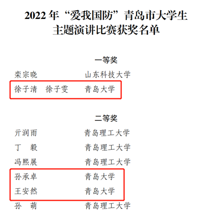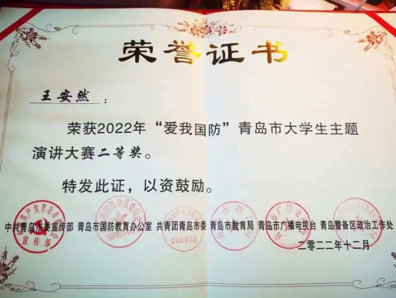 2020级食品科学与工程专业王安然同学在2022年度“爱我国防”青岛市大学生主题演讲比赛中获得二等奖的优异成绩。