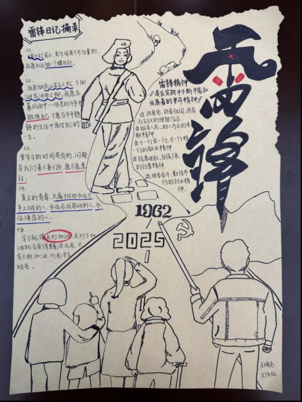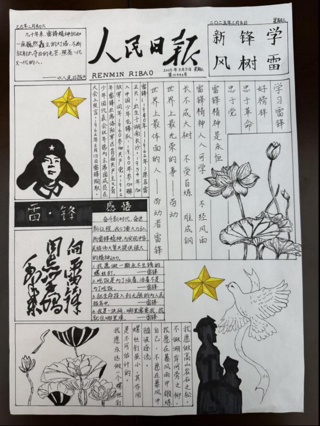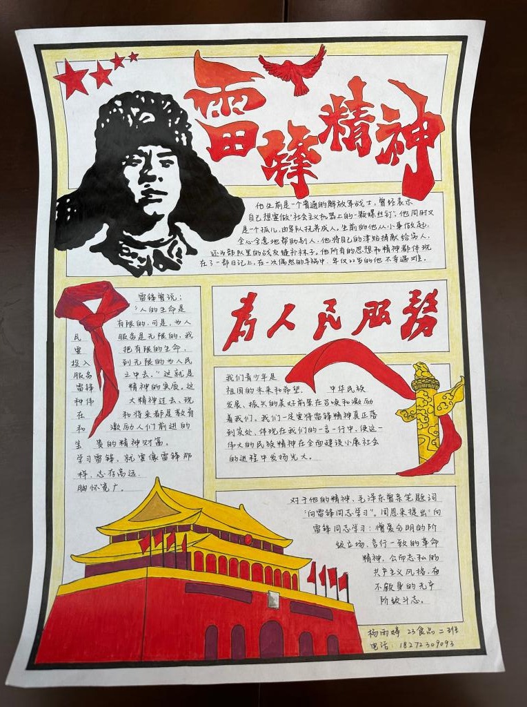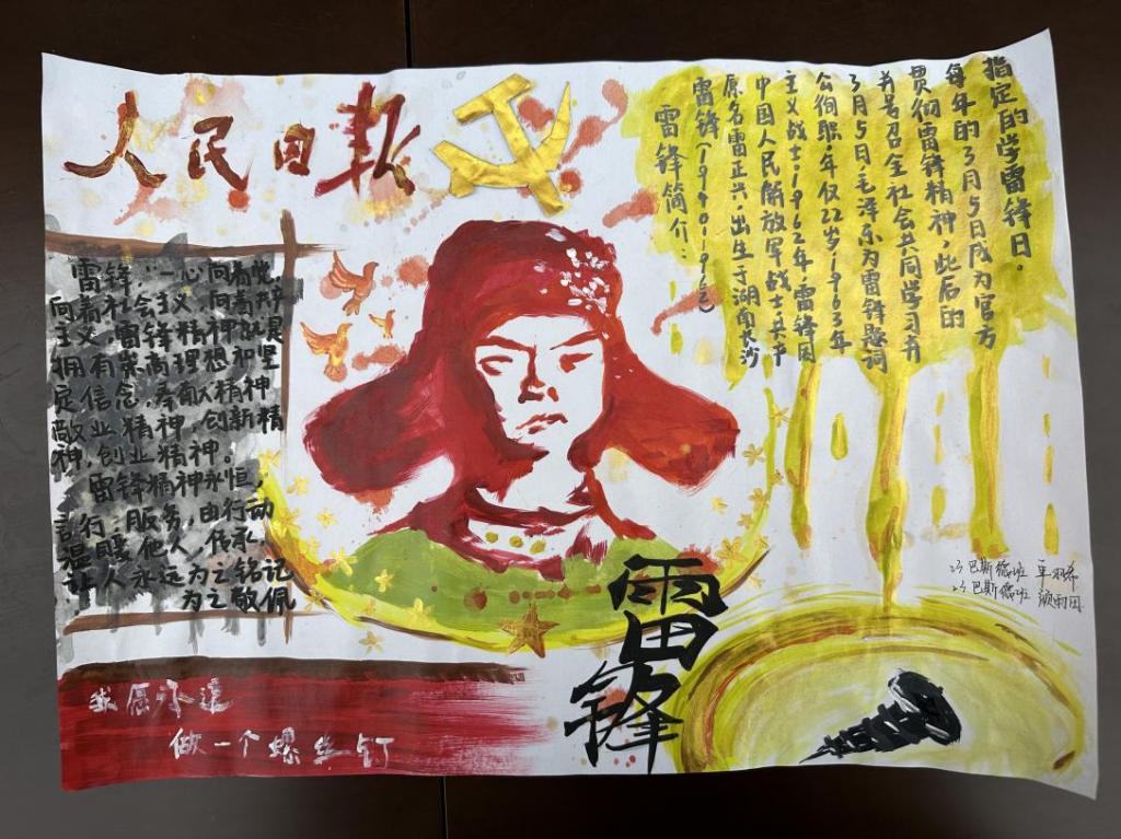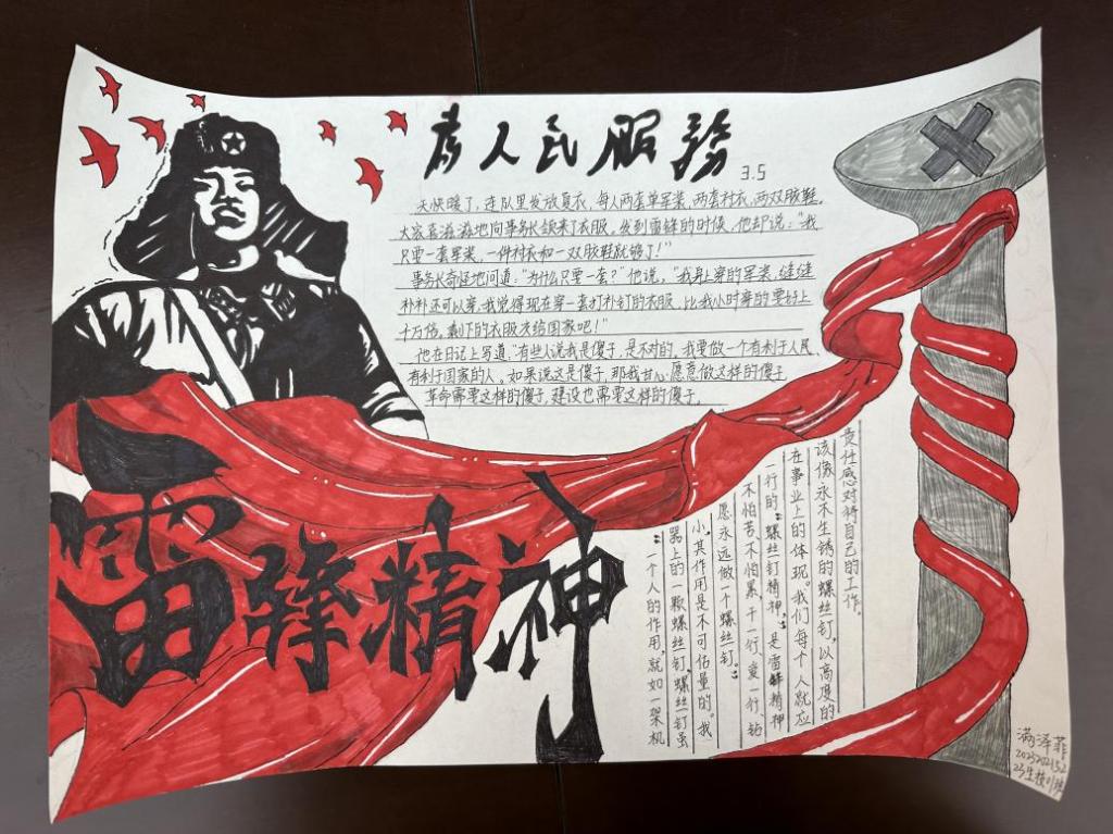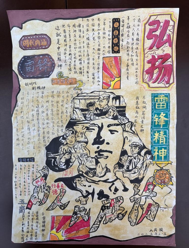 雷锋精神作为中华民族宝贵的精神财富,激励着一代又一代人为构建美好社会而不懈努力。为弘扬雷锋精神,传承中华美德,培养学院学生的道德情操和社会责任感,2025年3月,h动漫 开展了“笔绘雷锋光影,力践时代担当”手抄报制作活动。