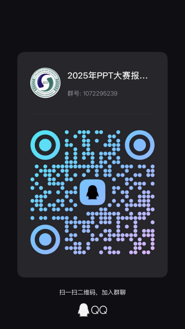 参赛同学可扫描下方二维码进入本次线上PPT大赛报名群,将PPT介绍以word文档形式上传至群文件,并在截止时间前将参赛PPT发至邮箱[email protected],PPT比例为16:9,小于60mb,PPT介绍文档与PPT命名方式均为年级+专业+姓名+学号。经工作人员筛选后,优秀作品将进入后续宣讲环节。所提交作品,默认学院有最终使用权。
