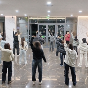 理论学习结束后,研会工作人员组织同学们在博雅楼大厅进行实践,动作从最初的略显生涩到逐渐流畅,现场充满了柔和而有力的气息。