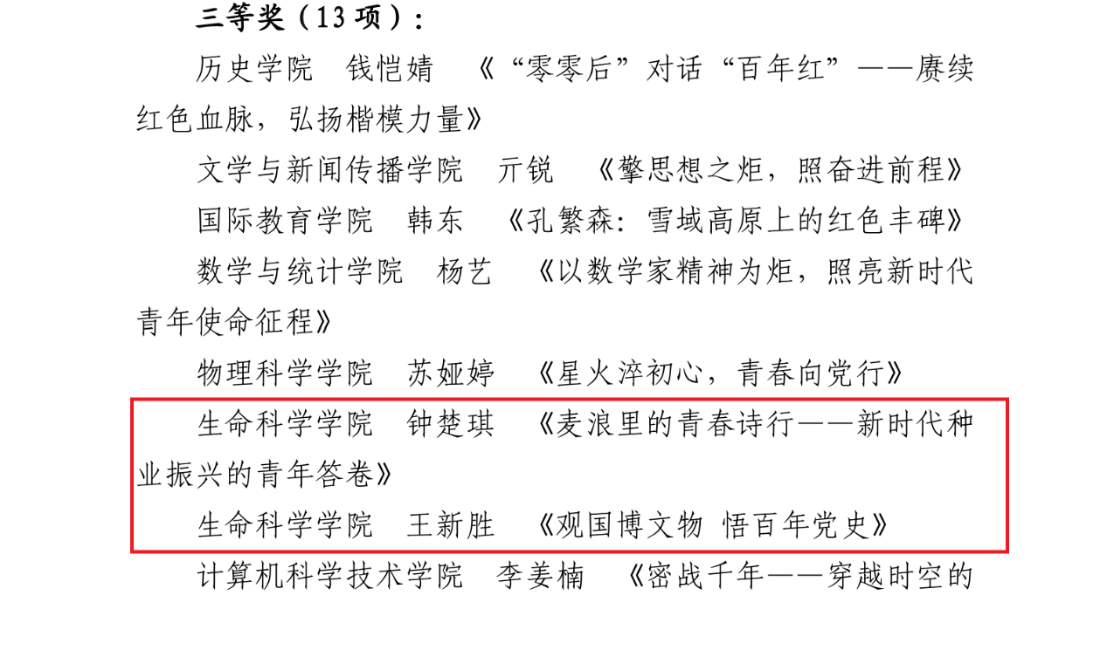王新胜老师,钟楚琪同学分别荣获三等奖,充分展现了学院党建引领与思政教育方面的扎实素养。
